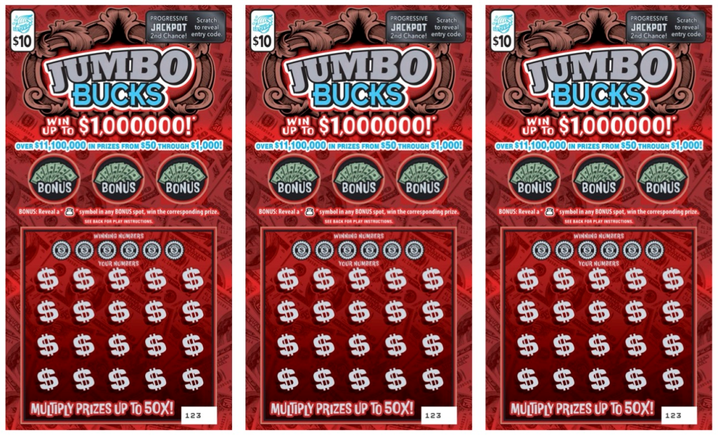 ผู้เล่นผู้โชคดีได้รับเงินรางวัลสูงสุด 1 ล้านเหรียญสหรัฐจากตั๋วขูดรางวัลมูลค่า 10 เหรียญสหรัฐ  จากJumbo Bucks